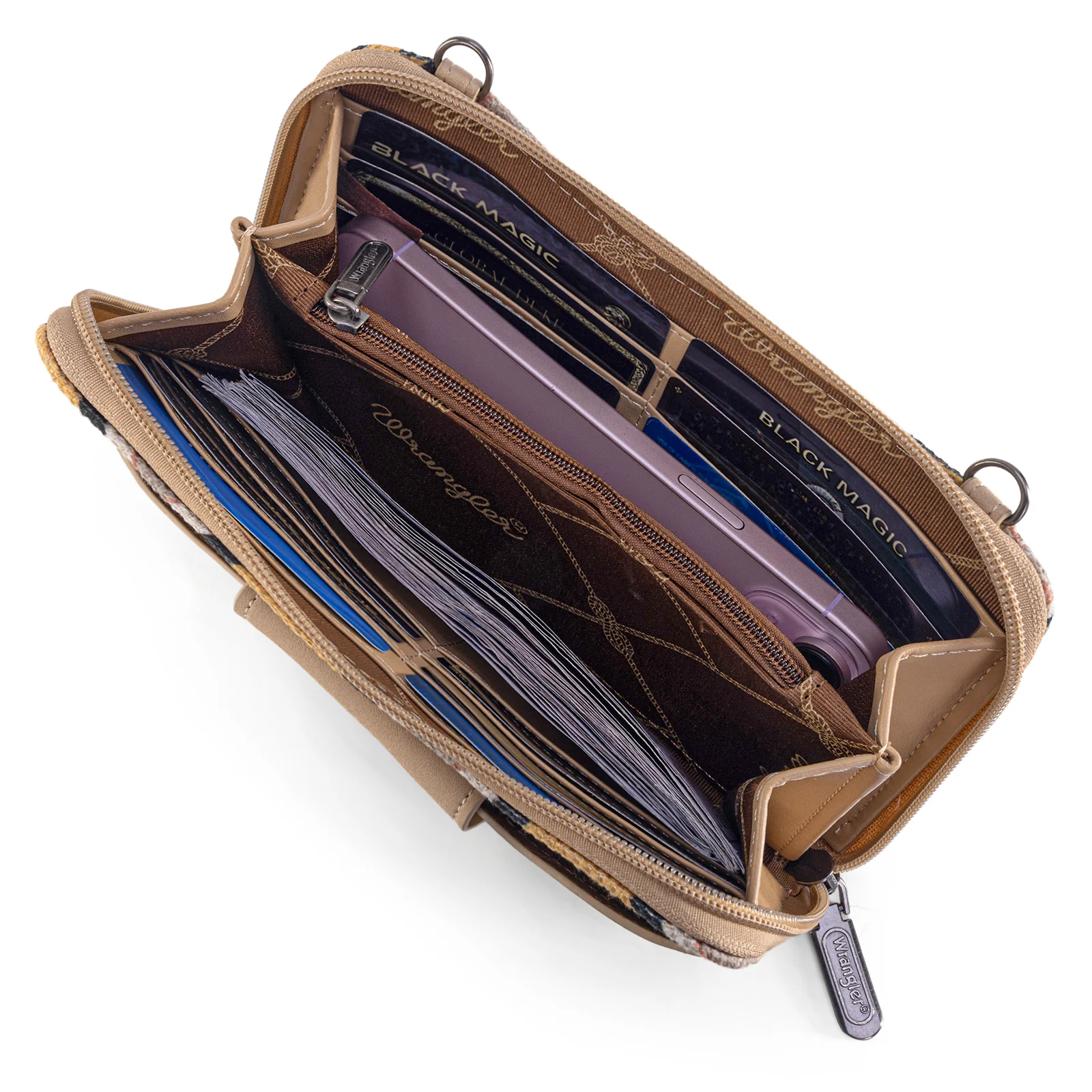Este bolso bandolera Distressed Aztec Wrangler cuenta con un compartimento de cartera frontal con detalles y cierre de cremallera. Incluye un espacioso compartimento principal, ranuras para tarjetas y una correa de lona desmontable para un uso versátil.