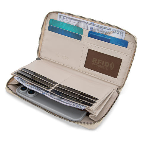 - Diseño práctico: Esta cartera tiene 12 ranuras interiores para tarjetas de crédito, 2 bolsillos para billetes, 1 bolsillo para monedas con cremallera, 1 compartimento para teléfono, 2 compartimentos abiertos para billetes, 1 correa de muñeca desmontable.
