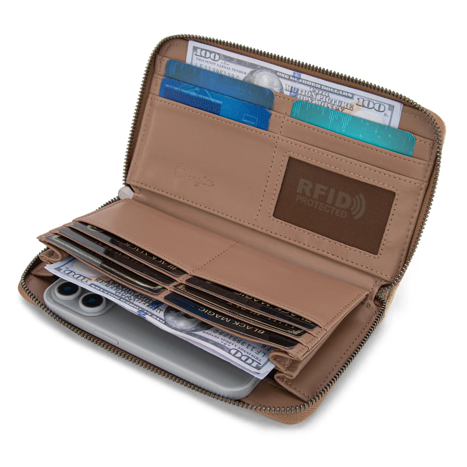 - Diseño práctico: Esta cartera tiene 12 ranuras interiores para tarjetas de crédito, 2 bolsillos para billetes, 1 bolsillo para monedas con cremallera, 1 compartimento para teléfono, 2 compartimentos abiertos para billetes, 1 correa de muñeca desmontable.